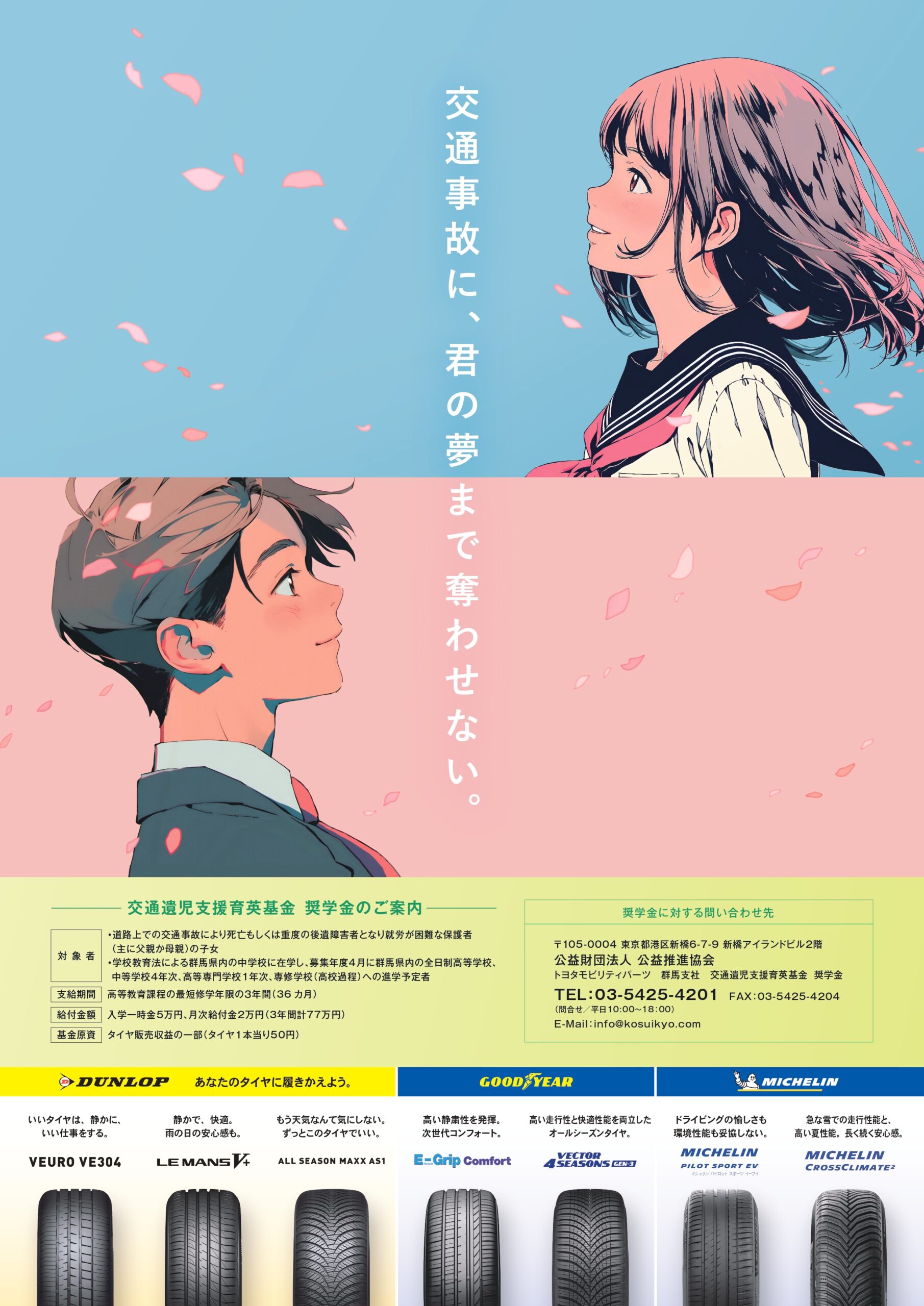 群馬支社では交通遺児の方の高校進学支援として、公益推進協会を通じて奨学金制度の支援を実施しております。詳細については、下記URLより「トヨタモビリティパーツ群馬支社 交通遺児育英基金 P&H奨学金(2025年度)」をご覧ください。